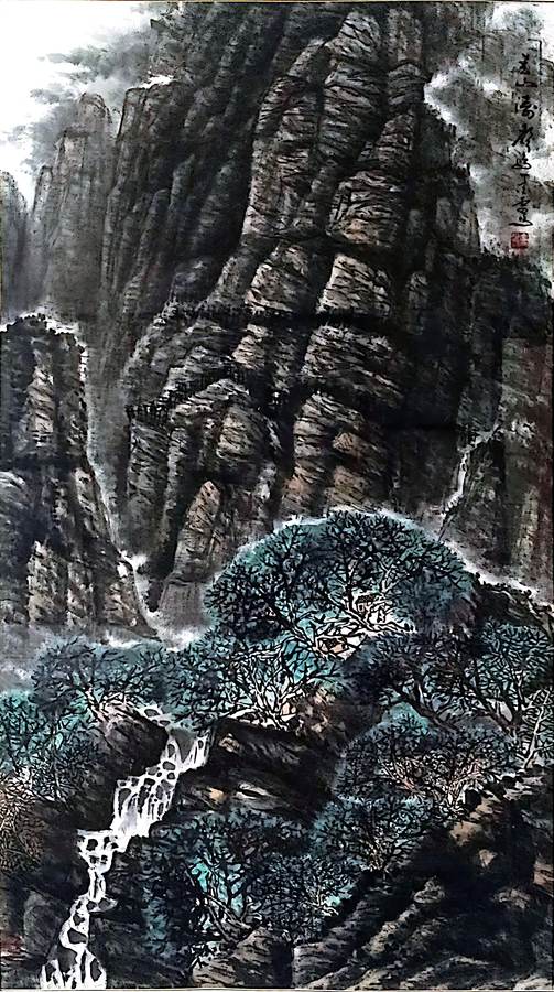 整幅作品以山石为骨、林木为肤、泉涛为魂,尽彰“春山涛声鸣”之境。从涧泉奔涌的涛声,到回荡天地的鸣响,再到林间轻淌的水声,层层递进恰合赏画诗“天地传鸣响,林来流水声”之韵,令观者仿若身临此境,耳畔涛声由壮及柔、由阔入幽,沉浸式山水意趣拉满。画作深得国画“意在笔先,境生象外”的艺术妙谛,尺幅之间,藏尽春山雄峻、林泉灵动,亦藏山水间最动人的自然之韵。