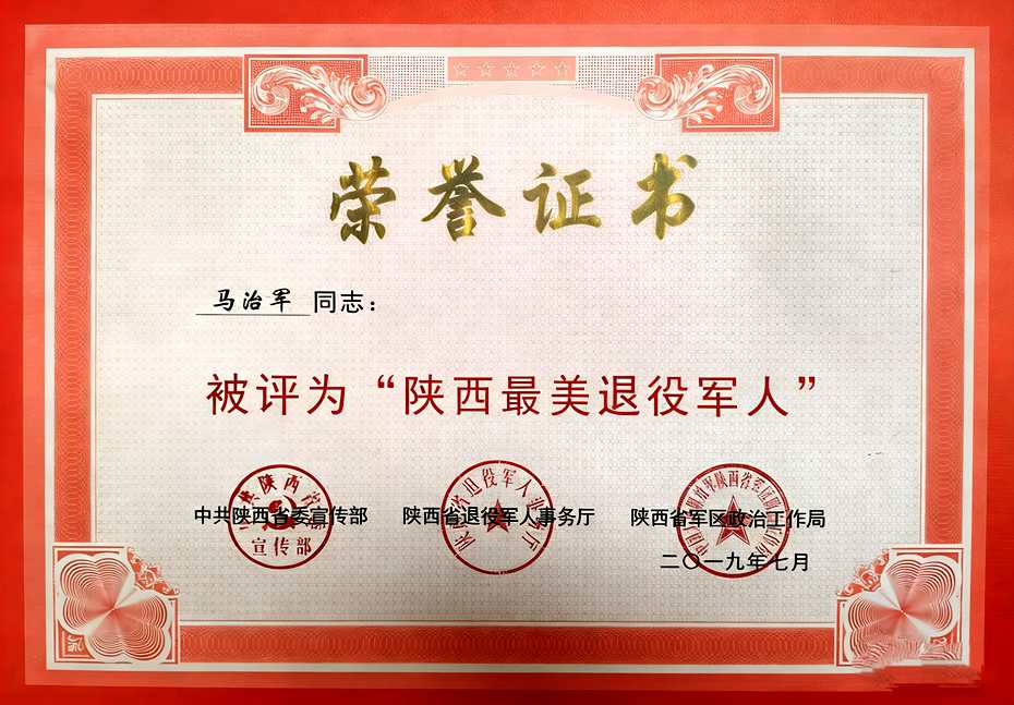 凭借卓越的社会贡献与个人成就,马志军战友先后荣获“陕西最美退役军人”“陕西省爱国拥军模范个人”、“中国双拥”年度人物提名奖,以及全国首届“最美老班长”等多项荣誉称号。