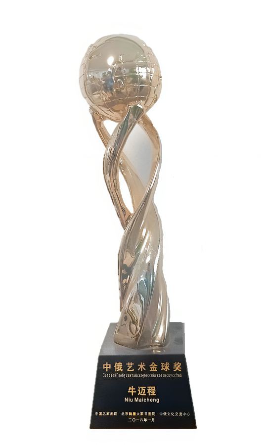 金球奖信息 这是中俄艺术金球奖奖杯,是为表彰艺术家在中俄文化交流与艺术领域的突出贡献而设立的荣誉奖项。 ★ 造型设计:奖杯以金色螺旋造型托起地球仪,象征艺术的交融与传播,寓意中俄文化交流的纽带作用与全球影响力。 ★ 底座铭文:底座明确标注奖项名称、获奖者“牛迈程”,以及颁发单位(中国名家画院、北京翰墨大家书画院、中俄文化交流中心)与颁发时间(2018年1月)。 ★ 文化背景:该奖项是中俄文化交流的重要见证,旨在推动两国艺术互鉴与合作,牛迈程凭借其书法艺术成就获此荣誉,体现了其作品在国际文化交流中的价值与影响力。