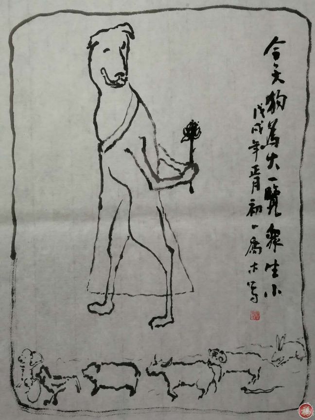 [题记]大年初一,吾友乔木漫画《今天狗为大,一览众生小》,画中,瑞犬披锦,合十献花,众肖膜拜,情趣盎然,令人遐想。仿佛瑞犬祈丰,又仿佛春犬求偶。故和诗凑趣。