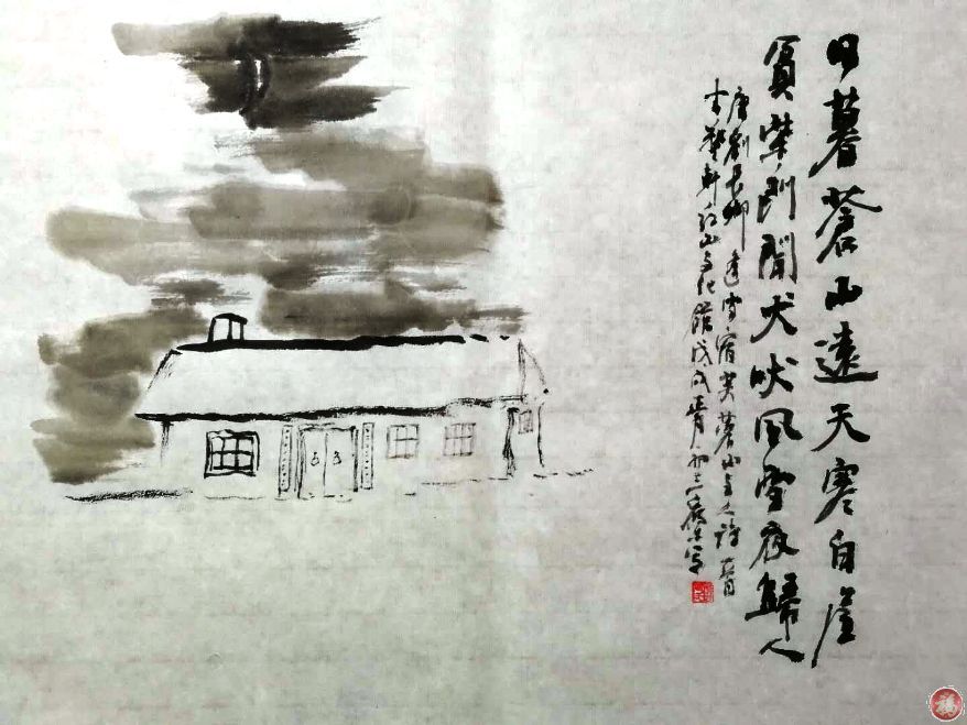 吾友乔木今漫画唐代诗人刘长卿之"雪宿芙蓉",诠释其"日暮苍山远,天寒白屋贫。柴门门闻犬吠,风雪夜归人"之意境。吾品之另趣,曲解为"君等道中人"而诗和。