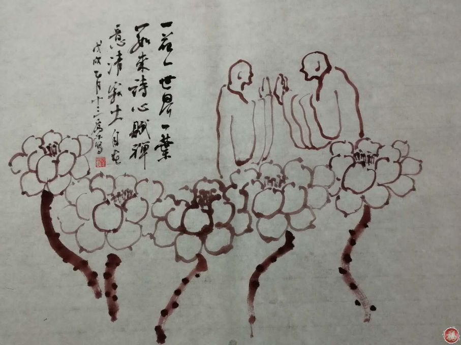 [题记]乔木禅画《一花一世界,一叶一如来》,画面中,双僧对拜,五莲相伴,并配佚名《读周思聪荷花》诗截句:一花一世界,一叶一如来。诗心赋禅意,清寂大自在"。一花一世界,语出《金刚经》、《梵网经》等佛学经典中。庐山东林寺三笑庭有一联即云:"桥跨虎溪,三教三源流,三人三笑语。莲开僧舍,一花一世界,一叶一如来。 乔木水墨禅意,冰心平淡,仿佛莲池清净地,如来花中坐,心无一物,不惹尘埃。其画面取舍有度,实处般若生,空处能包容。心中有佛皆佛心,随缘修性道无穷。故而七律禅诗配图合玉。