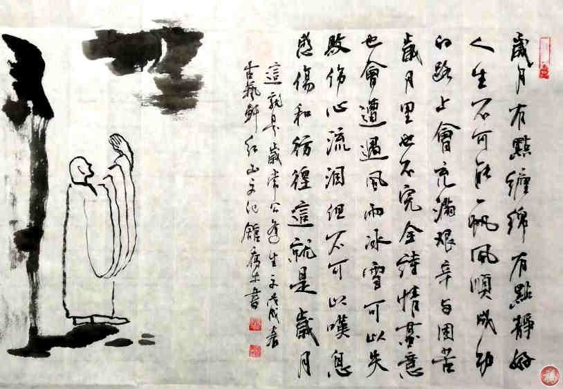 配图七绝 和常逢生、乔木之《岁月》晨帖 文/周阳生 [题记]晨见吾师常逢生发感悟岁月的美帖,继而又见吾友乔木禅而书画。常公帖云:"岁月,有点缠绵,有点静好;人生不可能一帆风顺,成功的路上会充满艰辛与困苦;岁月里也不完全诗情画意,也会遭遇风雨冰雪,可以失败、伤心、流泪,但不可以叹息、感伤和彷徨,这,就是岁月"。吾品读后,感悟良多,故七绝以和。 人生有憾惹心酸, 岁月无情难自欢。 众妙之门学容忍, 阿弥陀佛梵台槃。