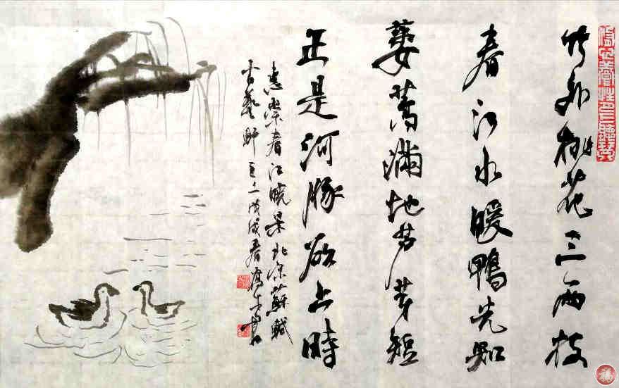 配图七绝 串场河畔春色晓景 周阳生[题记]乔木君水墨画宋代苏轼《惠崇春江晓景》诗意图,苏轼诗云:"竹外桃花三两枝,春江水暖鸭先知。萎蒿满地芦芽短,正是河豚欲上时"。吾虔以苏轼原韵,续写乔木君古艺轩红山文化馆所在地一一盐城串场河畔之春色晓景,放眼春色,盐城母亲河畔的迎宾公园内,春风拂柳,桃花绽放,紫燕绕云,风筝飞天,一派春意盎然。 春风和煦拂云枝, 一树桃花暖已知。 紫燕翩跹栖画阁, 绿鸢悠荡顺天时。