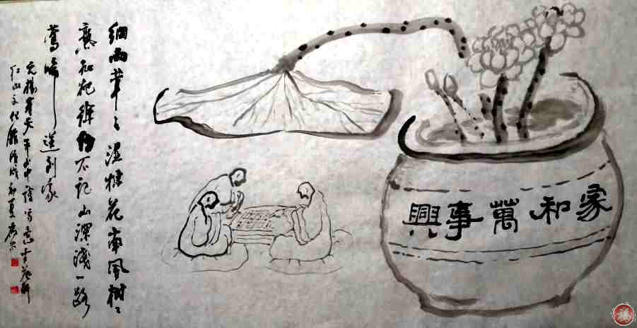 七绝-《月色荷塘》 一一和元代杨基《天平山中》 文/周阳生 图/乔木 [题记]乔木禅画元代诗人杨基《天平山中》之诗境,诗云: 细雨茸茸湿楝花, 南风树树熟枇杷。 徐行不记山深浅, 一路莺啼送到家。 吾品画和诗,杨基写《太平山中》,吾唱《月色荷塘》。杨基写楝花、枇杷,吾写荷花、弦月。杨基写一路莺啼送到家,吾和一帘幽梦到天涯。芳草兮?知音吾?尽在穿越隔空间。 濛濛霁雨湿荷花, 习习和风拂晚霞。 人映莲红弦月枕, 一帘幽梦到天涯。