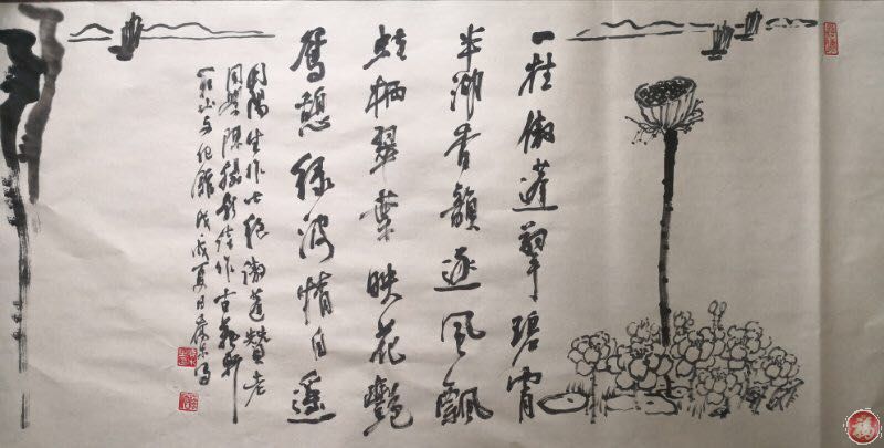 陆游全诗,充满闲情逸致,乡村的丰年景象跃然诗中,乡人的淳朴民风呼之欲出。乔木先生取诗中"山重水复疑无路,柳暗花明又一村”哲句而禅画。吾将"水复″当梅雨,又将"花明"作荷花,故以《雨游莲池》而续和。