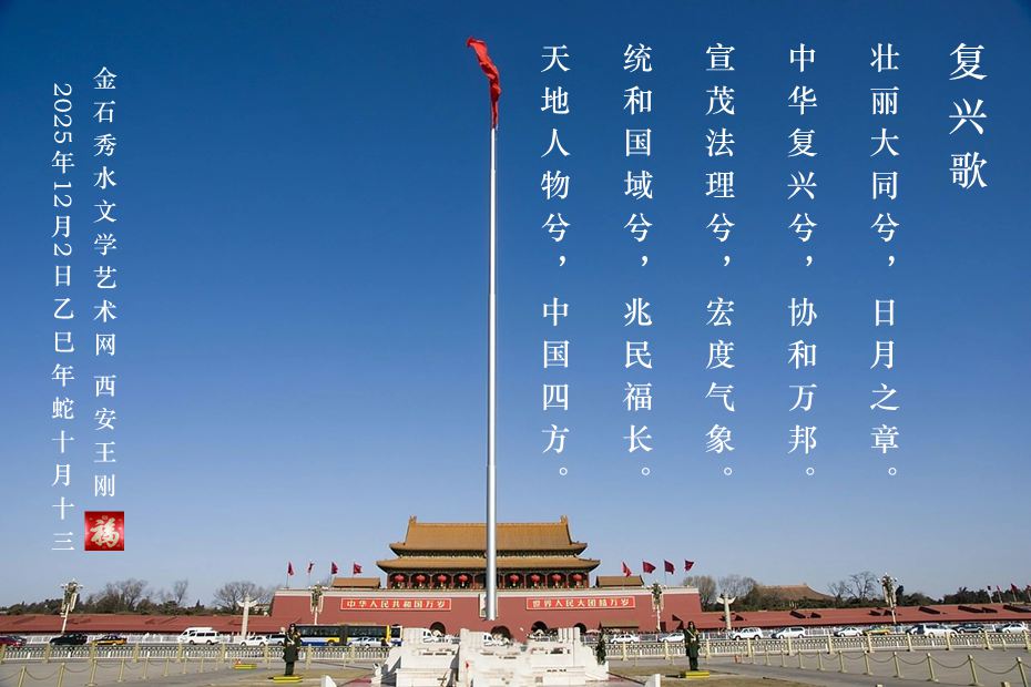 《复兴歌》逐句简约赏析(金石秀水) 1. 天地人物兮,中国四方:开篇铺展天地人国全景,“中国”溯源三千年文脉,“四方”勾勒疆域辽阔,气势雄浑。 2. 统和国域兮,兆民福长:锚定统一主权与民生核心,国域一统为根基,万民福祉绵长为初心,刚柔并济。 3. 宣茂法理兮,宏度气象:凸显法治昌明的制度底气,更显大国治理的宽广格局,让治理既有刚性又有温度。 4. 中华复兴兮,协和万邦:凝民族百年奋进之志,承华夏“和而不同”之脉,以复兴之力促天下共生,彰显大国担当与和平格局。 5. 壮丽大同兮,日月之章:升华大同理想,以日月喻永恒,让复兴伟业与文明愿景昭然天地,天长地久。