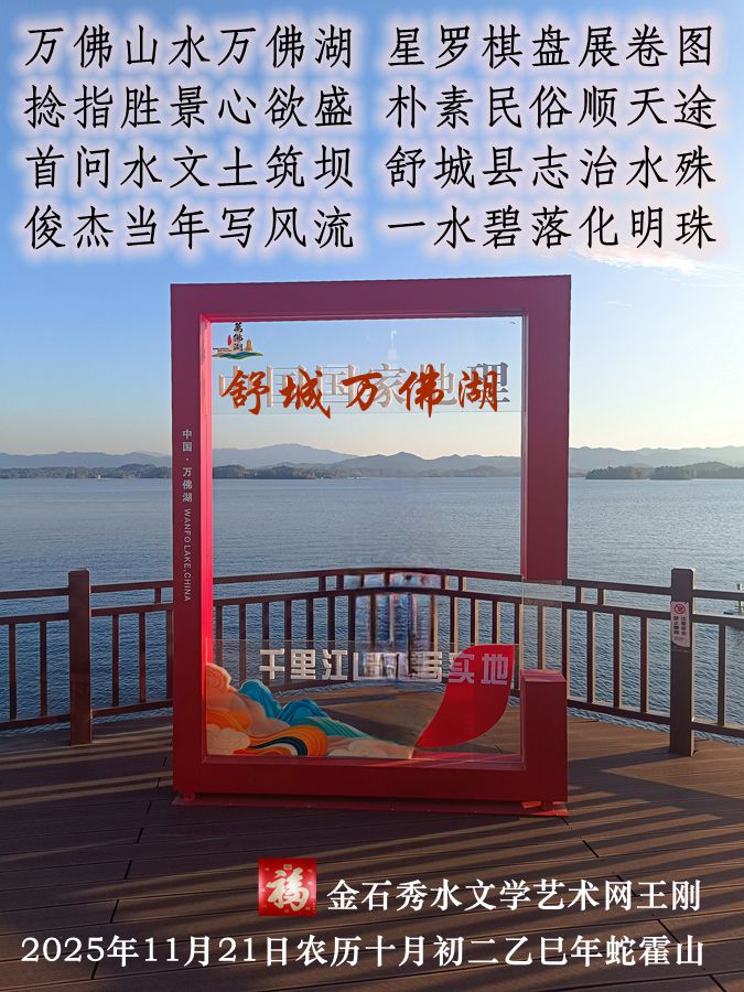 开篇“万佛山水万佛湖”,复沓如钟声回响。“万佛”二字,瞬间将一片水域从地理名词提升为精神象征。山水被冠以佛号,并非仅是形容山形如佛,更暗示着:这湖已被人的意志与劳作所“加持”,成为一座蕴含人间智慧的圣坛。紧接着“星罗棋盘展卷图”,视角从神圣俯视转为人文布局——岛屿是棋子,湖面是棋盘,历史是正在展开的卷轴。自然造化与人类规划在此完美叠印。