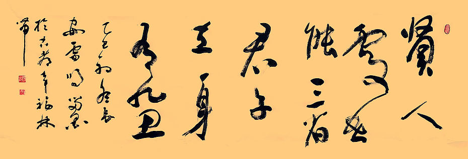 临别之时,蒙先生赠书法作品,书曰:“贤人处世能三省,君子立身有九思”,草书墨迹。贤人君子者,先生之追求,日三省,念九思,所蹈躬亲使然;其草书形意之高明,彰先生精神之独立、思想之自由。