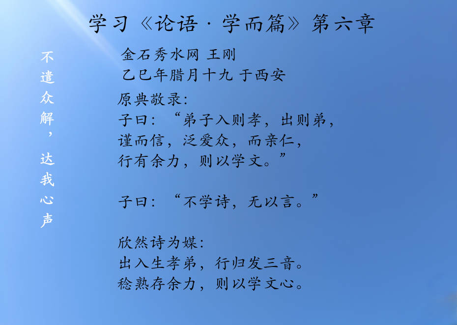 学习《论语·学而篇》第六章 金石秀水网 王刚乙巳年腊月十九 于西安 原典敬录 子曰:“弟子入则孝,出则弟,谨而信,泛爱众,而亲仁,行有余力,则以学文。” 子曰:“不学诗,无以言。” 欣然诗为媒: 出入生孝弟,行归发三音。稔熟存余力,则以学文心。