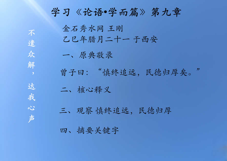 学习《论语•学而篇》第九章 金石秀水网 王刚 乙巳年腊月二十一 于西安 一、原典敬录 曾子曰:“慎终追远,民德归厚矣。” 不遣众解,达我心声 二、核心释义 曾子,名参,孔子弟子。终与始相对,发于始,慎于终;远与近相对,笃于近,追于远。 善始善终者必慎,慎终如始,则无败事(老聃语)。 由近欲远,千里之行始于足下(老聃语),以“追”念而行远。 故慎终追远,斯能见道。道者,民心之所向也;循道而行,则民德自成,殊途同归,道在其中,亦归于深厚。 三、观察 慎终追远,民德归厚 以“慎终追远”为丧葬祭祀之礼,实则窄化此章本意。 “慎终”,是对万事万物之终皆持审慎;始终为相对,“追远”,是从当下起点溯及本源。 民德归厚非静止不动,乃是动态更新、前仆后继之永续状态。 四、摘要关键字 慎终,追远,民德,归厚