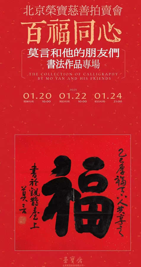 2025年1月20日至22日,“百福同心——莫言和他的朋友们的书法作品慈善专场拍卖会”,在北京荣宝斋隆重启幕。莫言师兄不仅奉上十余幅精心创作的书法作品,徐则臣、李浩、谢有顺、王振、姜宝才等文学界挚友亦鼎力相助,纷纷捐出跨界创作的得意之作。最终,所有拍品悉数成交——仅莫言师兄一幅“福”字,便拍出5.1万元高价。这不仅是公众对作家跨界书法的认可,更是社会各界对公益慈善事业的热忱回响。