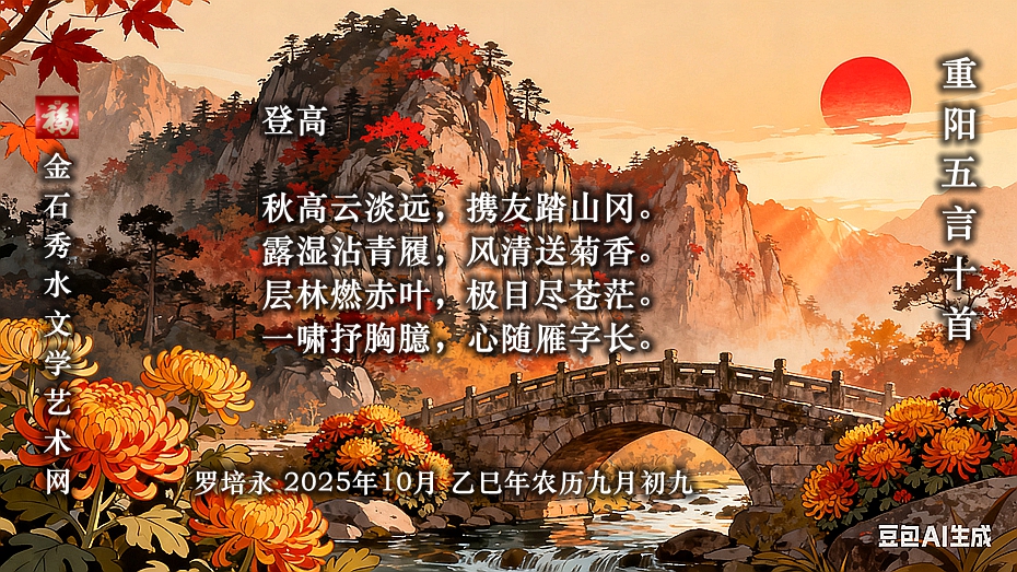 重阳五言十首 一罗培永 (一 )登高 秋高云淡远 携友踏山冈 露湿沾青履 风清送菊香 层林燃赤叶 极目尽苍茫 一啸抒胸臆 心随雁字长 (二 )赏菊 篱边金蕊绽 冷露沐芳丛 不与春红竞 独迎秋气浓 清姿凝雅韵 傲骨拒霜风 把盏临花坐 幽怀寄此中 (三) 插萸 佳节思亲切 茱萸插鬓旁 枝含霜后翠 香带露前凉 遥念天涯客 频添袖底香 愿凭此芳物 岁岁保安康 (四 )饮酒 新醅浮浅绿 篱菊绽金痕 举盏邀秋景 停杯忆故村 霜风侵袖薄 酒意暖心温 醉里抛尘事 唯留菊香存