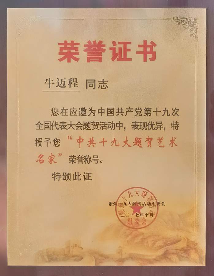 核心信息 这是牛迈程先生在2017年获得的荣誉证书,由“聚焦十九大题贺活动组委会”颁发,授予其“中共十九大题贺艺术名家”荣誉称号。 ★ 背景意义:该活动是为庆祝中国共产党第十九次全国代表大会举办的文化主题活动,邀请全国优秀文艺工作者以艺术作品为大会题贺,是对创作者艺术成就与社会贡献的双重认可。 ★ 价值定位:此称号不仅是对牛迈程书法艺术造诣的高度肯定,也体现了其作品在弘扬时代精神、传递文化价值方面的积极作用,是其艺术生涯中的重要荣誉。