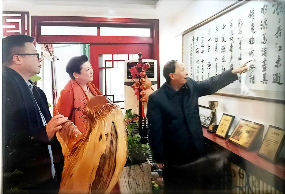 陕西省高层次人才领军人才、陕西省有特殊贡献专家、著名作家邢小俊教授(左一),瀚林控股集团董事长林颖(左二),来访牛迈程书法艺术工作室。右为牛迈程