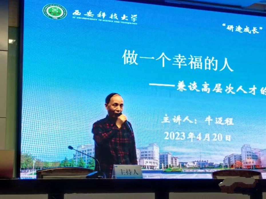 为了深入学习贯彻党的二十大精神,进一步加强研究生思想与价值引领,4月20日晚,西安科技大学研究生工作部在骊山校园图书馆报告厅举办“研途成长”学术文化讲座,邀请著名书法家、西安科技大学原宣传部部长牛迈程做主题报告。研究生工作部全体人员及研究生代表近300人参加。