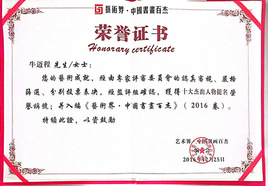 牛迈程先生荣获十大杰出人物提名并入编《艺术界·中国书画百杰》