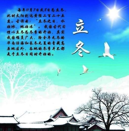 光阴如梭节气快,霜降过后立冬来,阳光惨淡无热烈,北风萧瑟摇落叶,气温剧降天气凉,雨水落地凝霜雪,草木凋零山野瘦,天少晴日地多霾,天冷莫忘苦寒人,多送温暖多献爱。