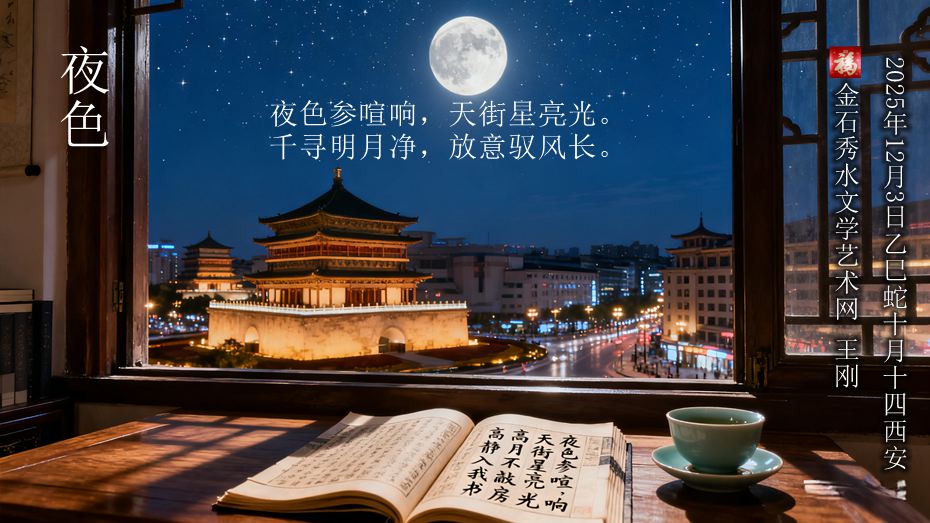 夜色 [西安] 王刚 夜色参喧响,天街星亮光。 千寻明月净,放意驭风长。 2025年12月2日西安