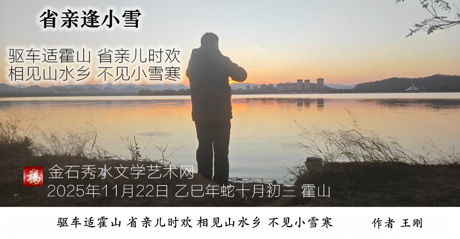 1. 驱车适霍山,省亲儿时欢 ★ “驱车”点明出行方式,动作具象化,暗含归乡的急切;“适霍山”中“适”字文雅,既指前往霍山(贴合地域背景),又比“赴”“往”更具文学韵味。“省亲”直指核心主题,“儿时欢”以回忆勾连过往,开篇便奠定“归乡忆旧”的温馨基调,简洁却情感饱满。 2. 相见山水乡,不见小雪寒 ★“相见山水乡”呼应首句“霍山”,勾勒出故乡山水环绕的实景,兼具画面感与亲切感;“不见小雪寒”是全诗点睛之笔:既点明“小雪”节气的时间背景,又以气候的“寒”与亲情的“暖”形成强烈对比,暗喻亲人相见的温情驱散了节气的寒意,情感真挚且余味悠长。