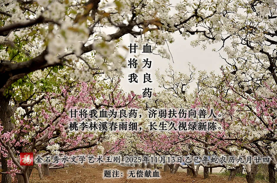 《甘将我血为良药》一诗,以素朴之言写深挚之怀,将现代公民的献血义举,悄然接续进东方古老的生命哲学长河中。其动人处,正在于那清浅文字下静水流深的慈悲与洞见。