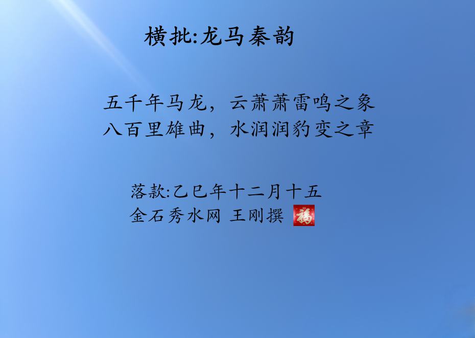 横批:龙马秦韵 上联:五千年马龙,云萧萧雷鸣之象 下联:八百里雄曲,水润润豹变之章 落款:乙巳年十二月十五 金石秀水网 王刚 撰