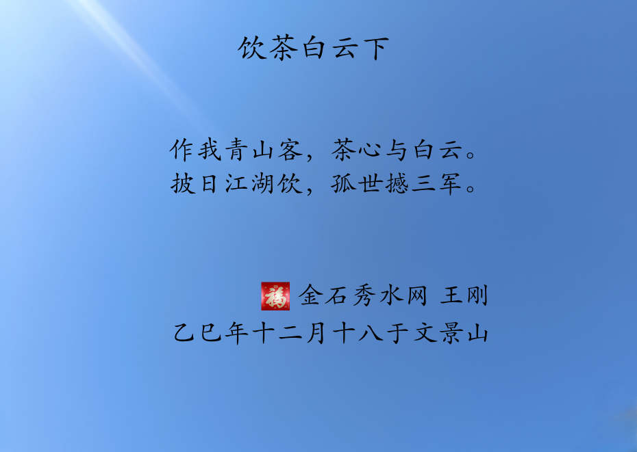 饮茶白云下王刚作我青山客,茶心与白云。披日江湖饮,孤世撼三军。乙巳年十二月十八于文景山