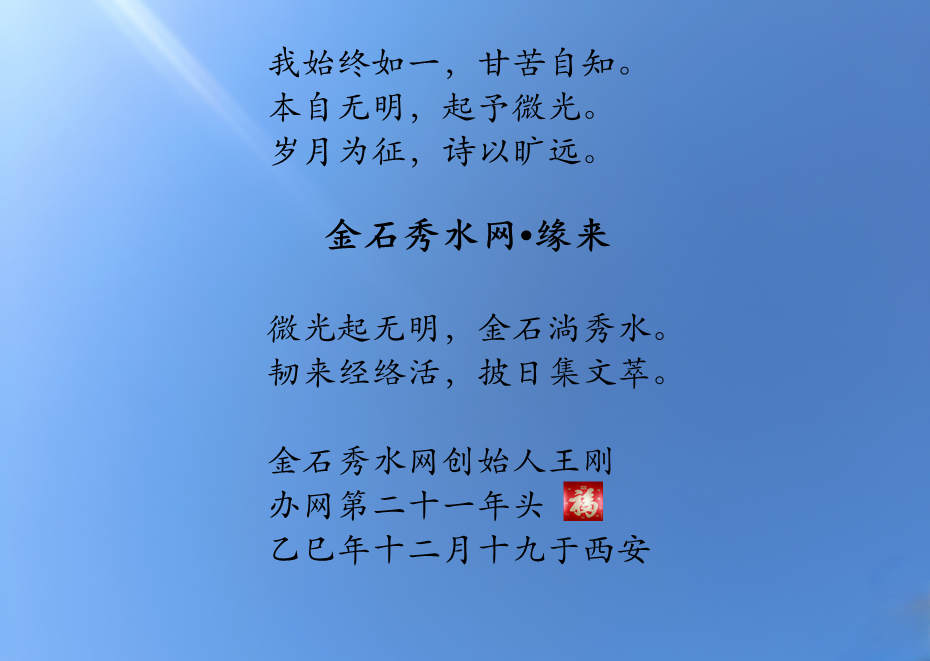 我始终如一,甘苦自知;本自无明,起予微光;岁月为征,诗以旷远。金石秀水网•缘来微光起无明,金石淌秀水。韧来经络活,披日集文萃。金石秀水网创始人王刚办网第二十一年头乙巳年十二月二十于西安