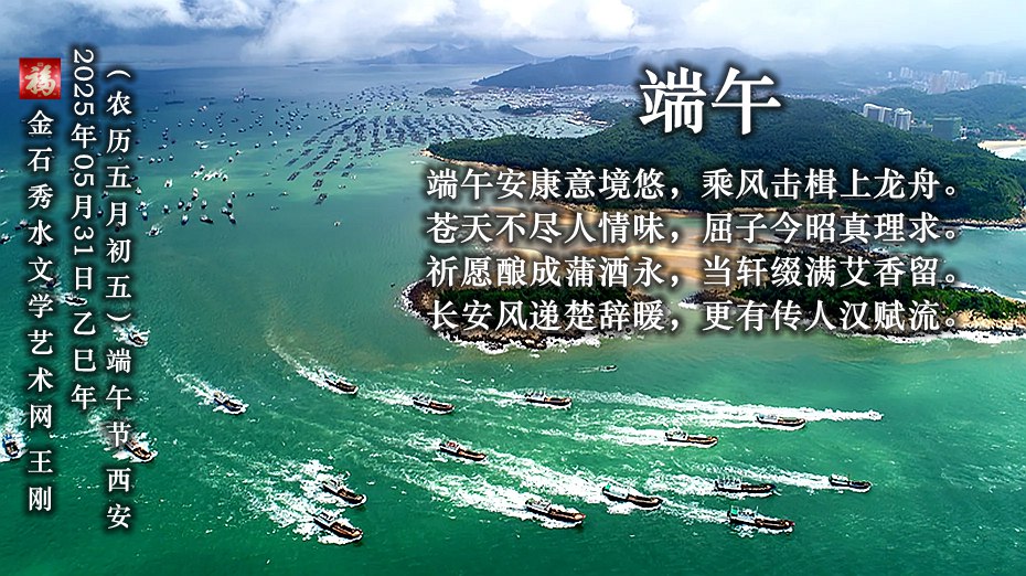 端午 王刚 端午安康意境悠,乘风击楫上龙舟。 苍天不尽人情味,屈子今昭真理求。 祈愿酿成蒲酒永,当轩缀满艾香留。 长安风递楚辞暖,更有传人汉赋流。
